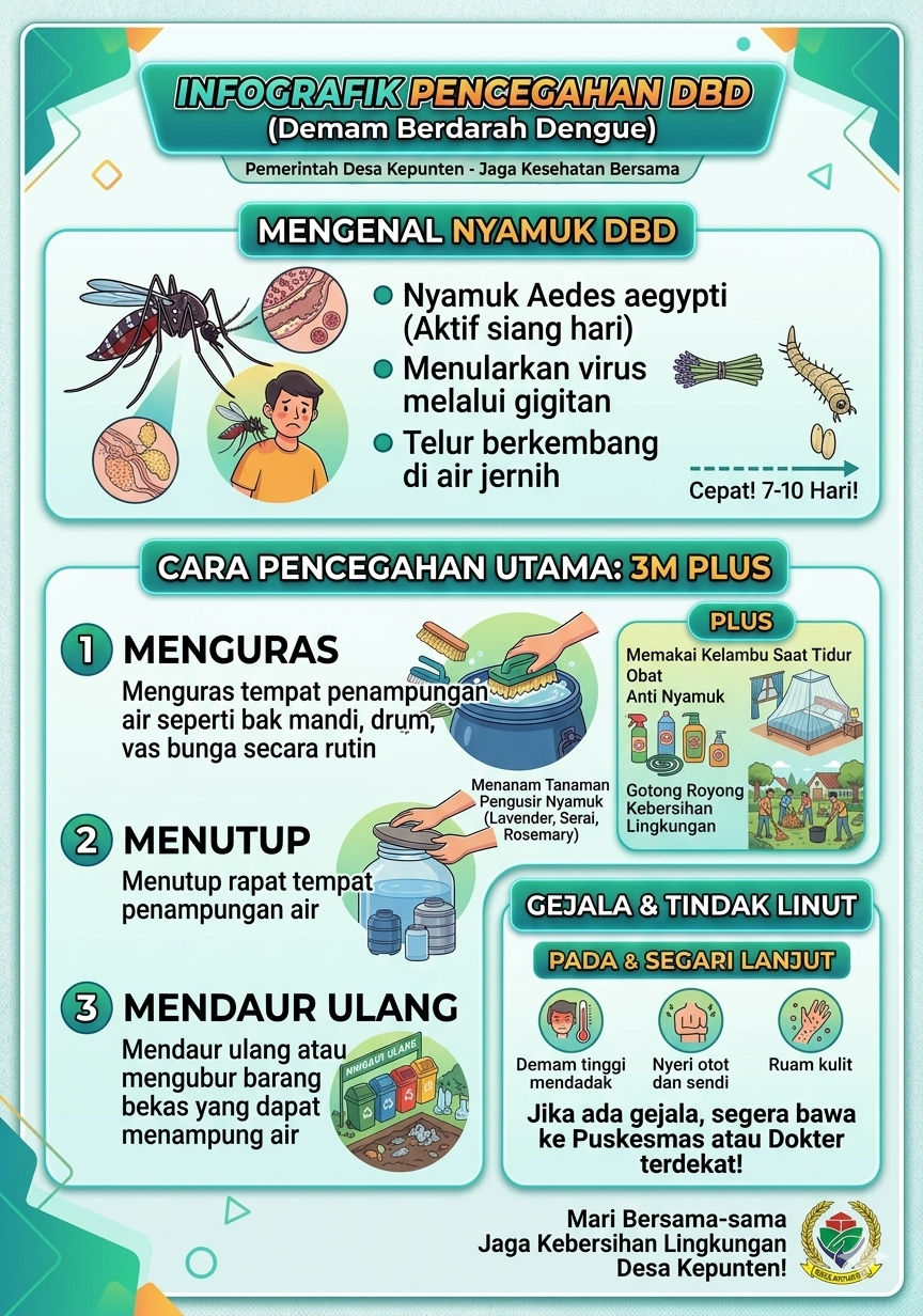 Untuk mencegah penyebaran DBD, masyarakat Desa Kepunten diimbau untuk aktif melakukan Pemberantasan Sarang Nyamuk (PSN) 3M Plus secara rutin minimal satu minggu sekali.